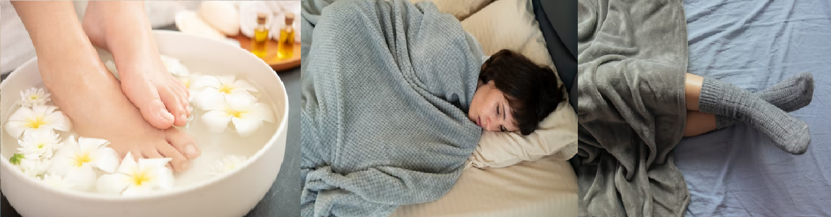 睡前可以準備水溫可接受的熱水來泡手和泡腳,時長大約10-20分鐘,可以使末梢血液循環變好,同時也助於睡眠。同時,也要加強下肢的保暖,腹部一定要蓋上棉被或是毛毯。